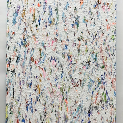 In her recent Mylar series, color illuminated by reflection, along with mylar’s unpredictability of forms, provides many avenues to explore her interest in luminous color, resulting in the fusion and blurring of lines between a painting and object. She pours thin veils of pigmented resin, floating one atop another. Often it is necessary to sand in between layers.